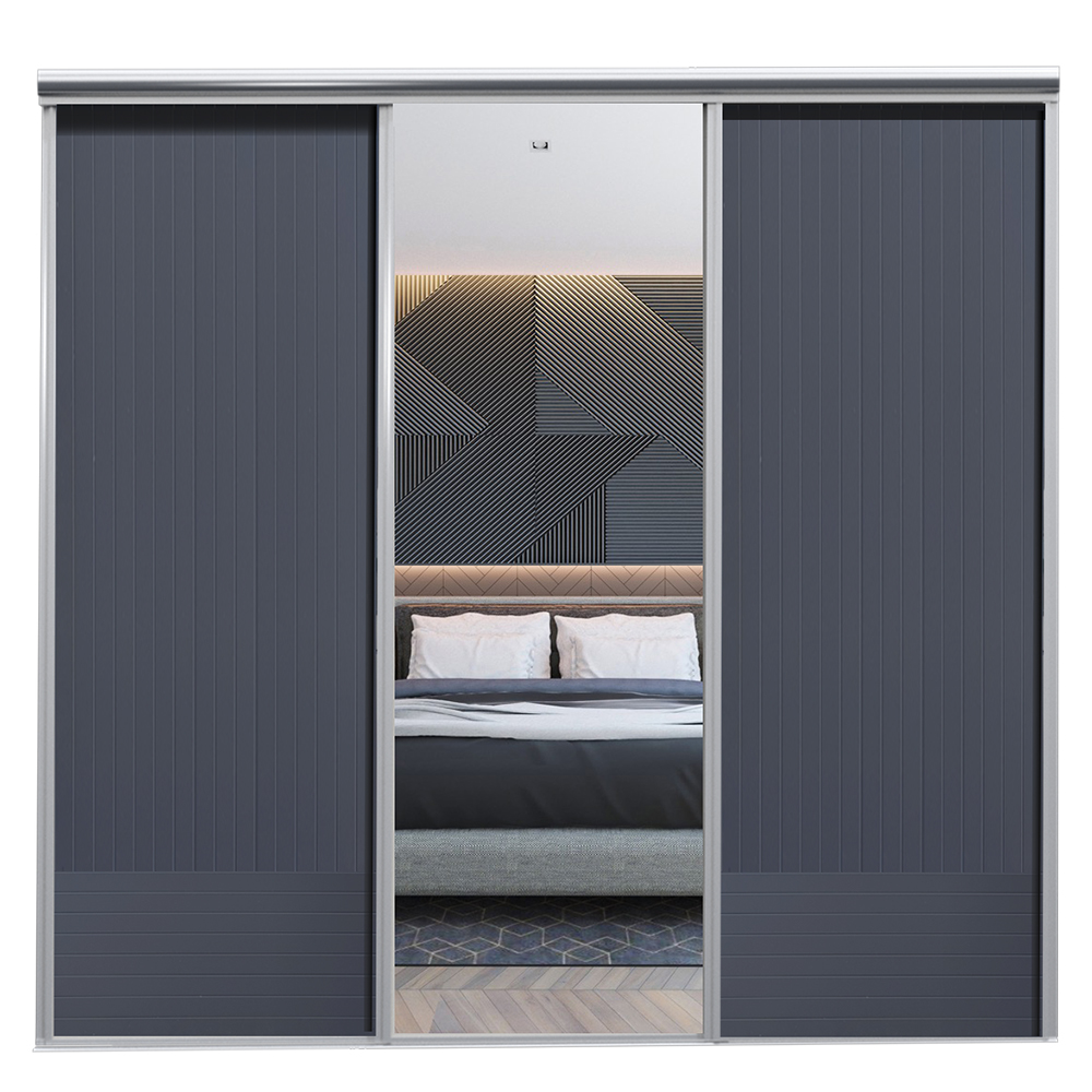 Skjutdörrarna är av 8 mm melaminbelagd MDF och spegeln är av 4 mm spegelglas med en säkerhetsfilm på baksidan. Grepplist, tak- och golvskena i aluminium.