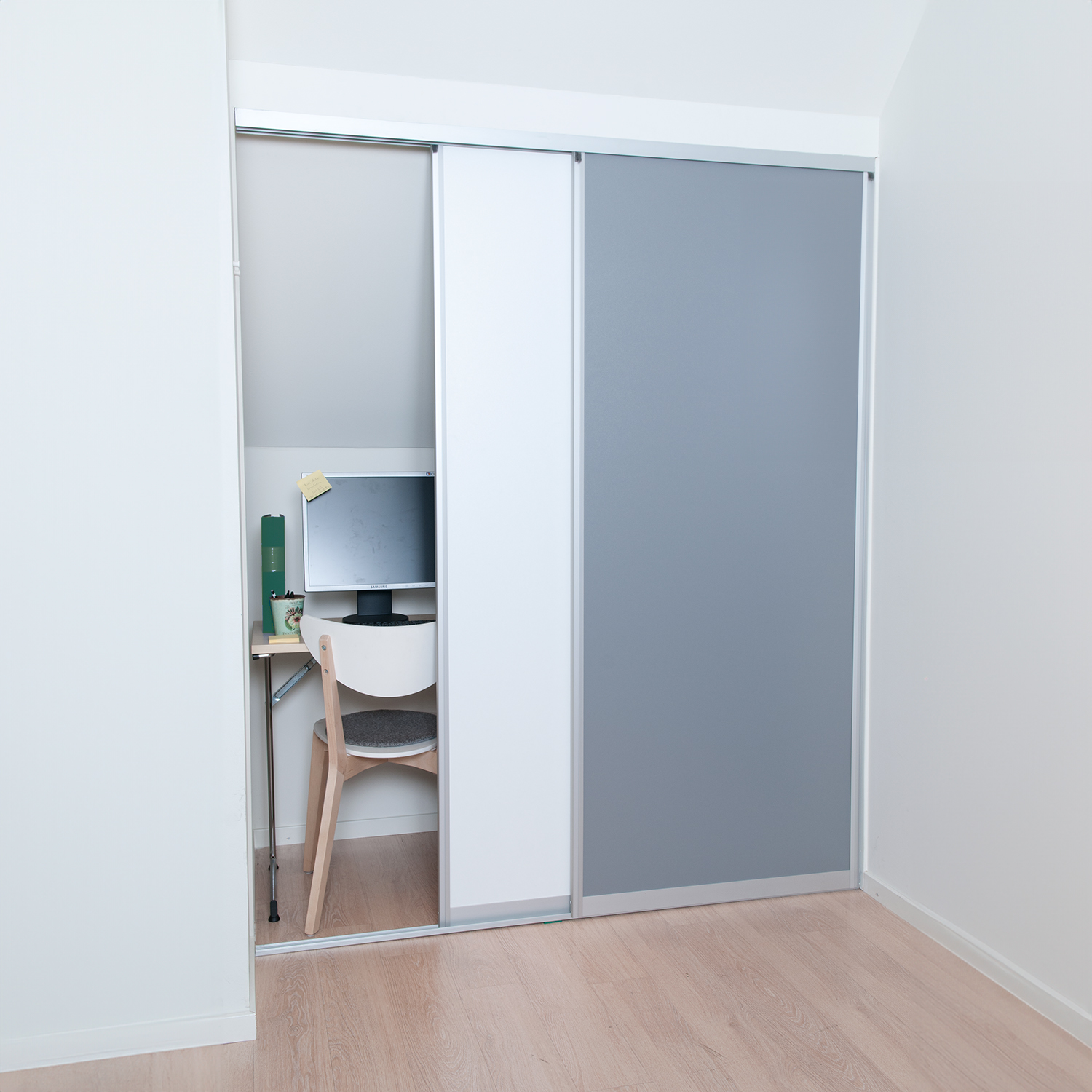 Skjutdörrarna är av 10 mm melaminbelagd MDF. Grepplist, tak- och golvskena är i aluminium.