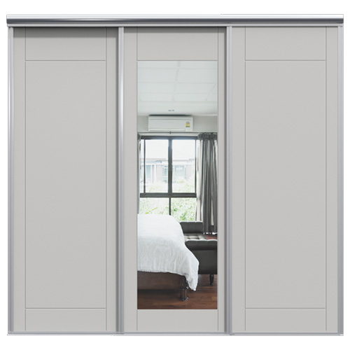 Skjutdörrarna är av 8 mm målad och spårfräst MDF och spegeln är av 4 mm spegelglas med en säkerhetsfilm på baksidan. Grepplist, tak- och golvskena i aluminium.