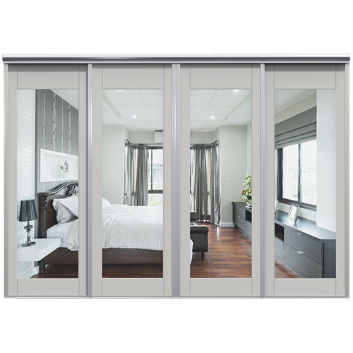 Skjutdörrarna är av 8 mm målad och spårfräst MDF och sspegeln är av 4 mm spegelglas med en säkerhetsfilm på baksidan. Grepplist, tak- och golvskena i aluminium.