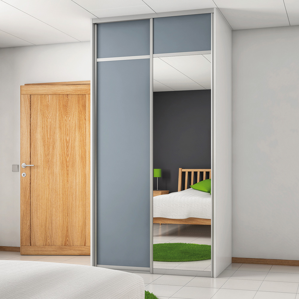 Skjutdörren Vit/Grå är av 10 mm melaminbelagd MDF. Spegelskjutdörren är av 4 mm spegelglas med en säkerhetsfilm på baksidan. Grepplist, tak- och golvskena i aluminium.
