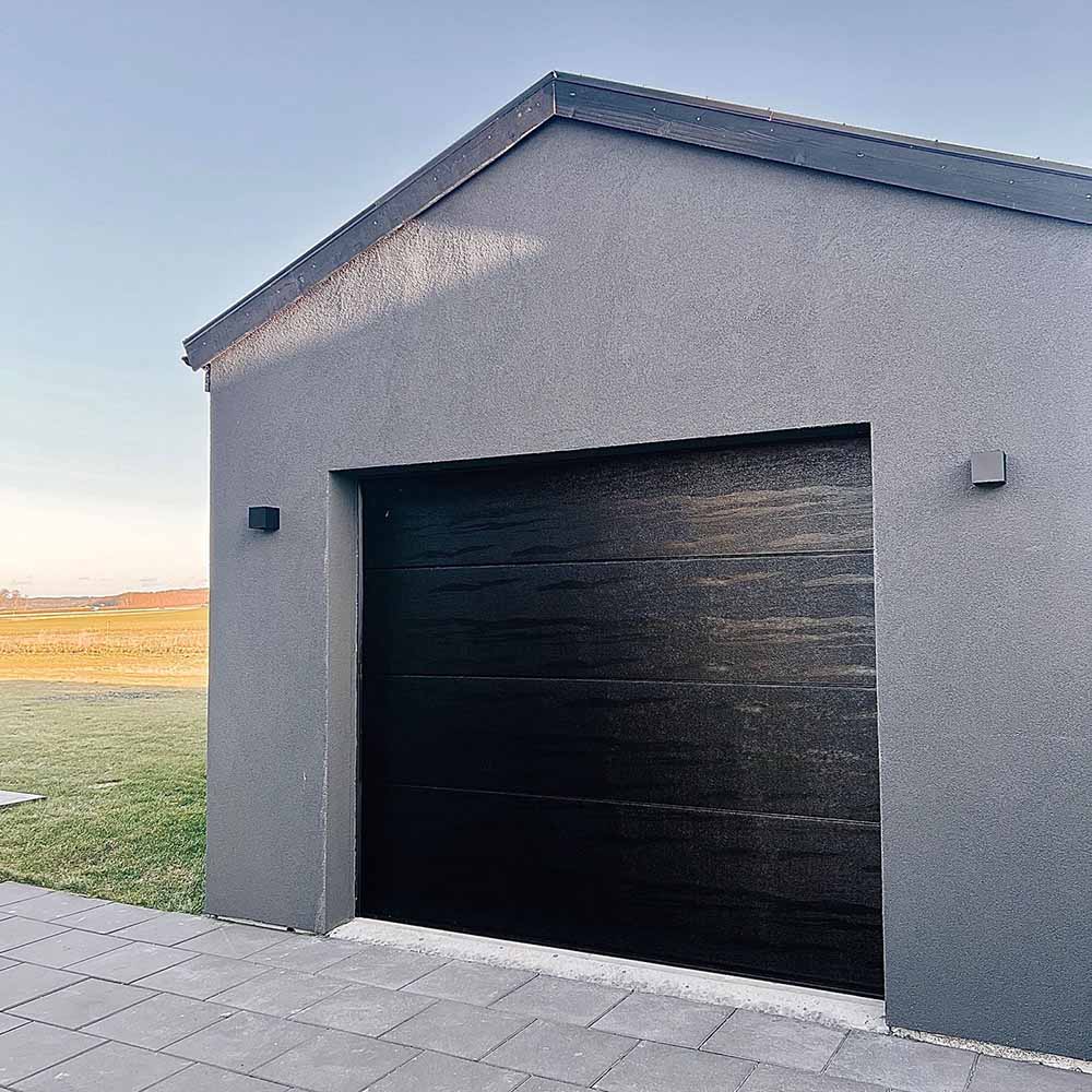 Stabil garageport med en trästruktur på ytan som gör att den inte är helt slät vilket ger den det där lilla extra.