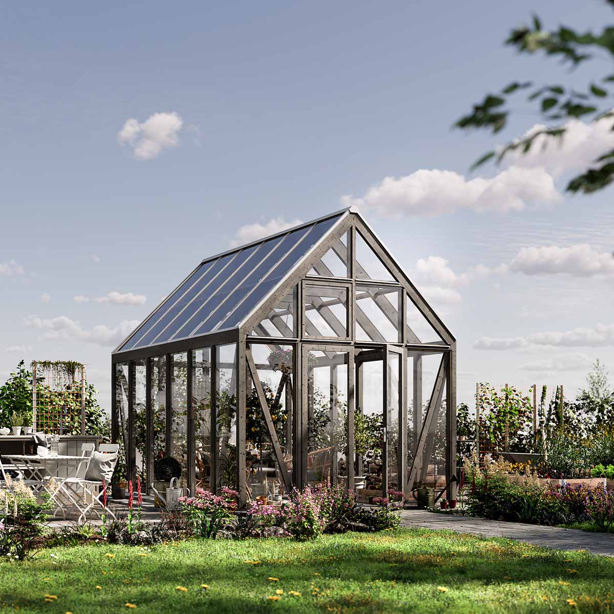 Växthuset är gjort av gedigna limträstommar i doppimpregnerad gran som ger dig möjlighet att välja grundfärg och täckfärg själv. Ska den gifta eller skilja sig från ditt hus? Måla det i vilken kulör du vill. Allt beror på vilken effekt du vill ha.