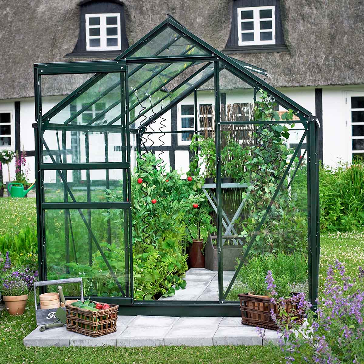 Kliv in i detta växthus som har en bra takhöjd och känn doften av tomaterna och örterna. För dig som vill ta dina första steg att börja odla på riktigt i ett växthus eller bara koppla av.