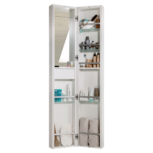 IDO Glow högt spegelskåp med smart förvaring. Utfällbar sminkhylla med spegel ovanför och generös förvaring på insidan av dörren.