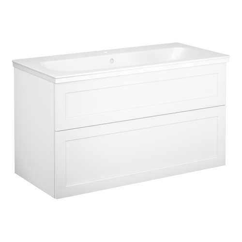Tvättställskåp med en vitmålad front med ramspegel i traditionell stil.