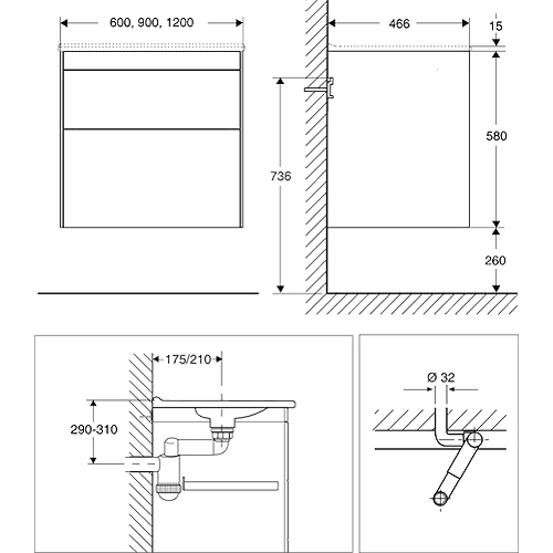 | Tvättställsskåp (Bredd/Djup/Höjd) | 600 x 466 x 580 mm |