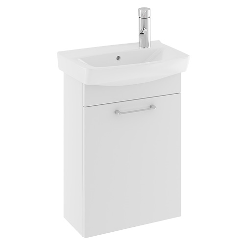 Tvättställsskåp Ifö Spira 400/500 är ett komplett och stilrent möbelpaket som passar utmärkt till det mindre badrummet eller för gästtoaletten. Badrumsmöbeln består av ett färdigmonterat tvättställsskåp med flyttbart hyllplan och ett tvättställ med blandarhål på höger- eller vänster sida. Luckorna är mjukstängande och handtagen (178 mm) är i mattkrom. Stommen till badrumsmöbeln är tillverkad i frukttrög spånskiva och dörrarna av fukttrög lackad MDF.