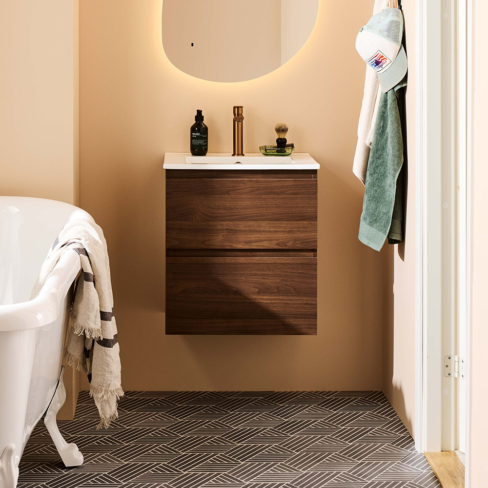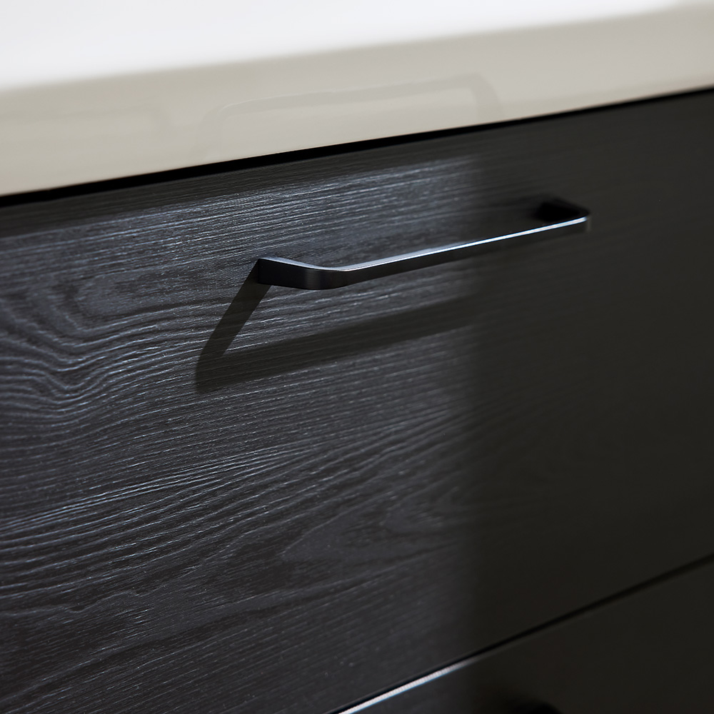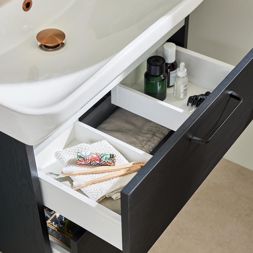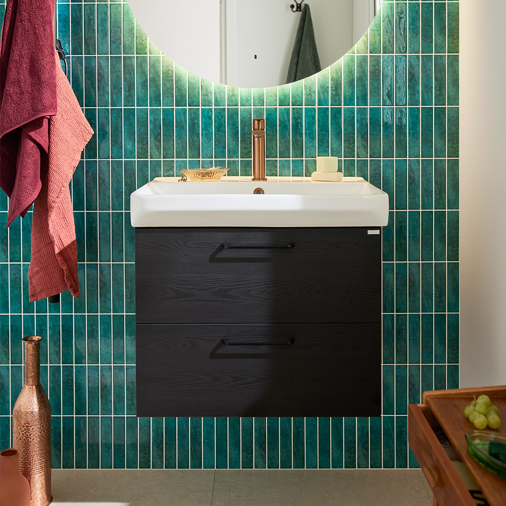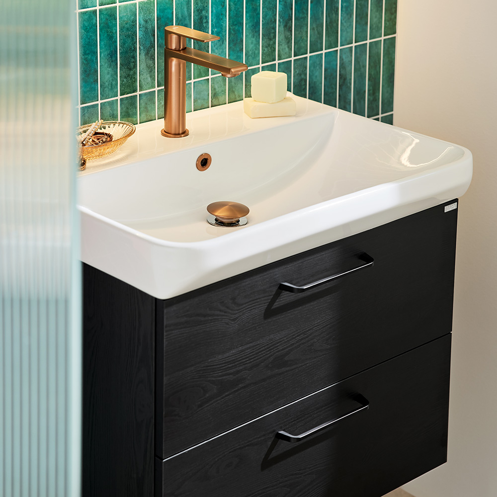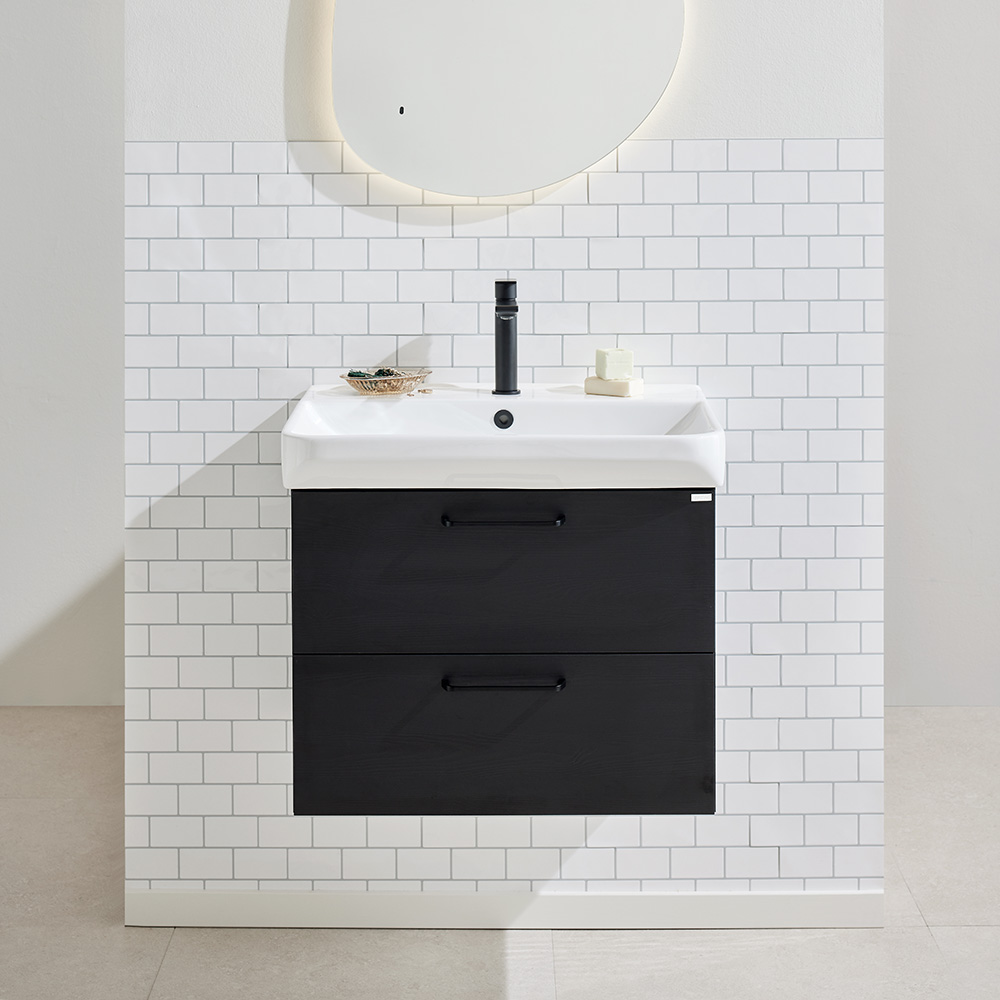 Noro Air är ett modernt tvättställsskåp med handtag. Möbeln har ett lite grundare djup som gör den idealisk för badrum där du vill spara utrymme men ändå få bra förvaring. Det medföljande porslinstvättstället har mjuka former och sträcker sig lätt utanför möbeln framtill, vilket ger både funktion och design. Air kan väljas i svart trästruktur eller vit matt, så att du enkelt kan matcha din badrumsstil. Komplettera gärna med tvättställsblandare, bottenventil, avloppssats och eluttag.