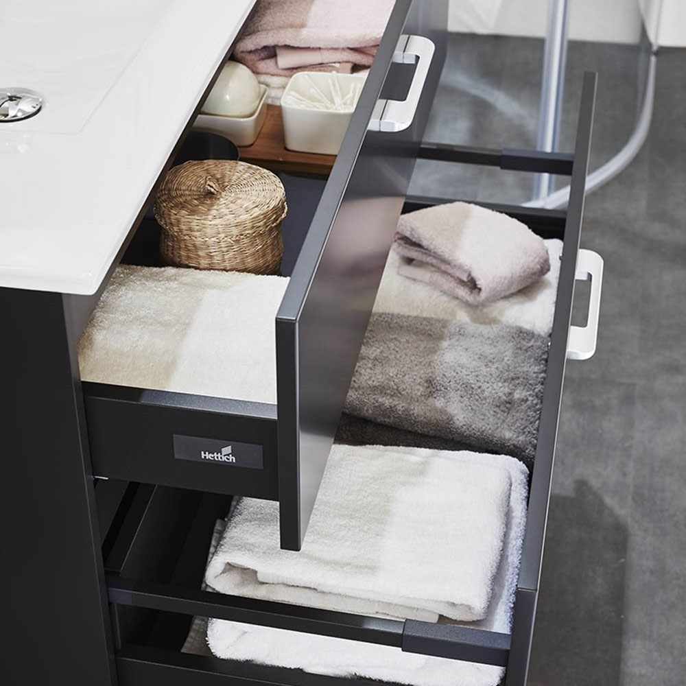 City tvättställsskåp har mjukstängande lådor med fullutdrag. Justerbara upphängningsbeslag för enkel installation och justering. Lådinredning och uttagbar lådmatta ingår.