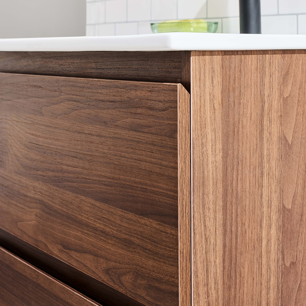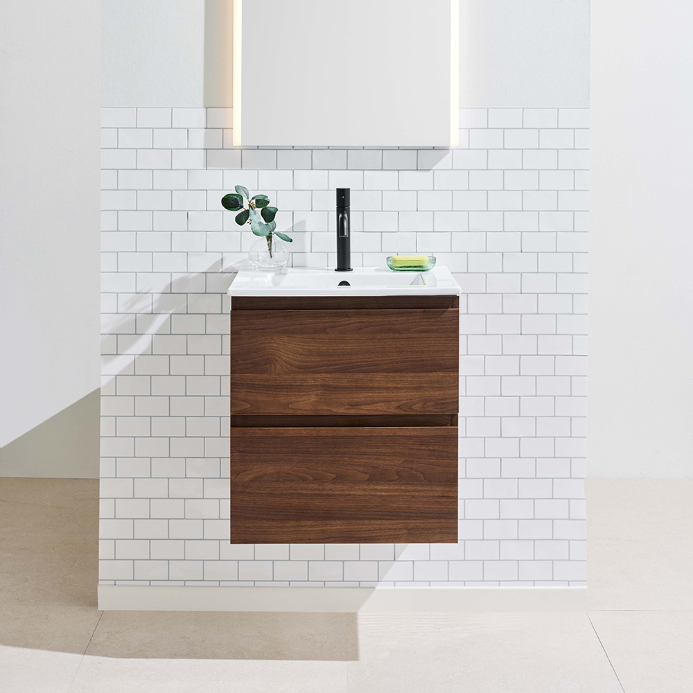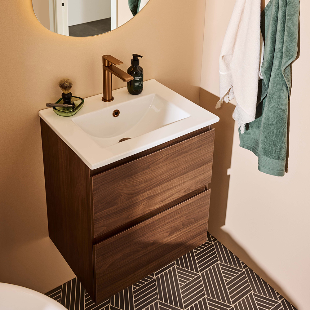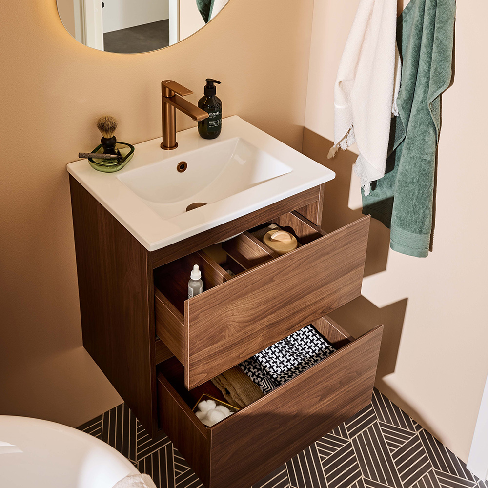 Noro Vega är ett stilrent tvättställsskåp i ett praktiskt, mindre format som passar perfekt i det lilla badrummet. Möbeln har två rymliga lådor med Soft Close och integrerade grepp, vilket ger både bra förvaring och en modern känsla. Det medföljande porslinstvättstället har raka linjer och en slitstark yta. Vega är förberett för både vägg- och golvavlopp och levereras omonterat. Välj mellan tre olika utföranden – vit matt, valnöt eller ljus ek – för att matcha din badrumsstil. Komplettera gärna med tvättställsblandare, bottenventil och avloppssats.