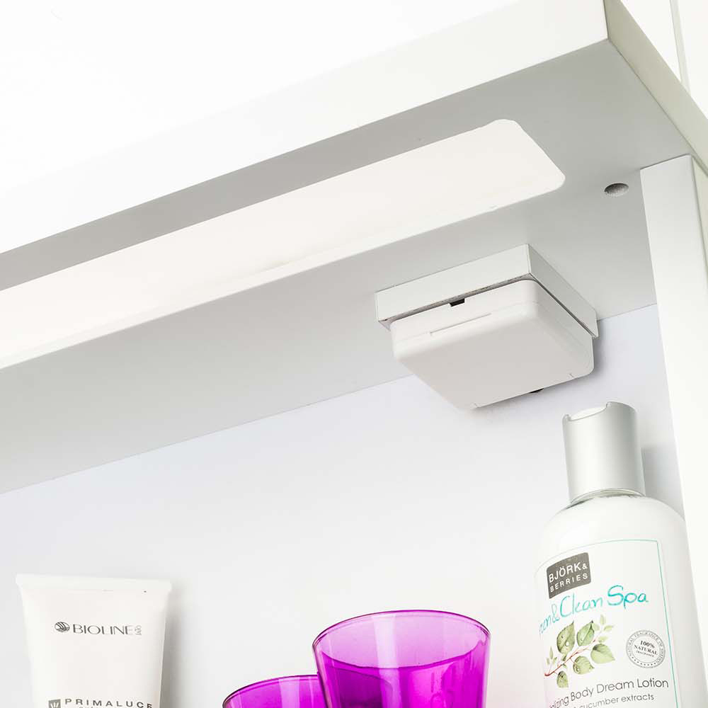 Inuti skåpet finns ett förmonterat 230V eluttag på höger sida. Det passar perfekt för rakapparat eller hårtork och kan enkelt flyttas till vänster vid behov. Alva levereras färdigmonterad och är redo att sättas upp direkt.