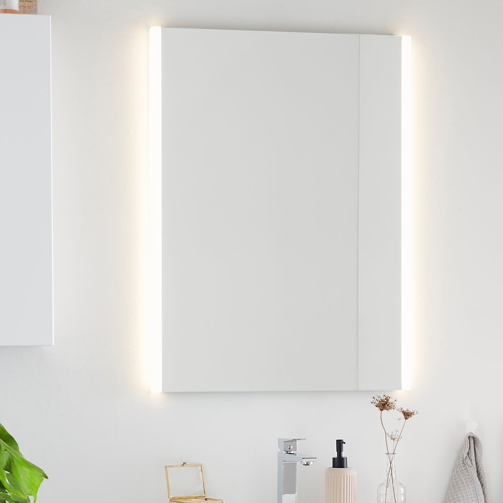 Den integrerade belysningen i spegelns sidokanter ger perfekt belysning för exempel sminkning eller rakning. Ljuskällan sprider sig åt tre olika håll för att också belysa rummet. Kan kombineras med Noro:s Fix Trend serie eller med någon annan kommod med tvättställ som passar din smak.
