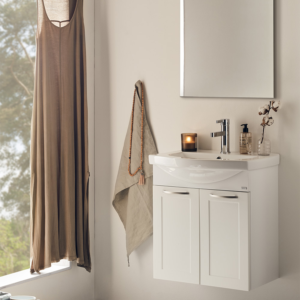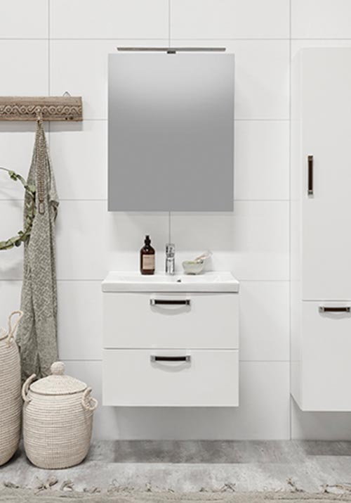 Rengör med fuktad trasa, använd milda rengöringsmedel vid behov. Undvik medel med slipande effekt, syror och ammoniak. Våra möbler är utrustade med vattenavstötande material, dock tål de inte direkt vattenkontakt under en längre tid. Vid montering nära badkar eller dusch bör badkarsvägg, duschvägg eller annan avskärmning användas.