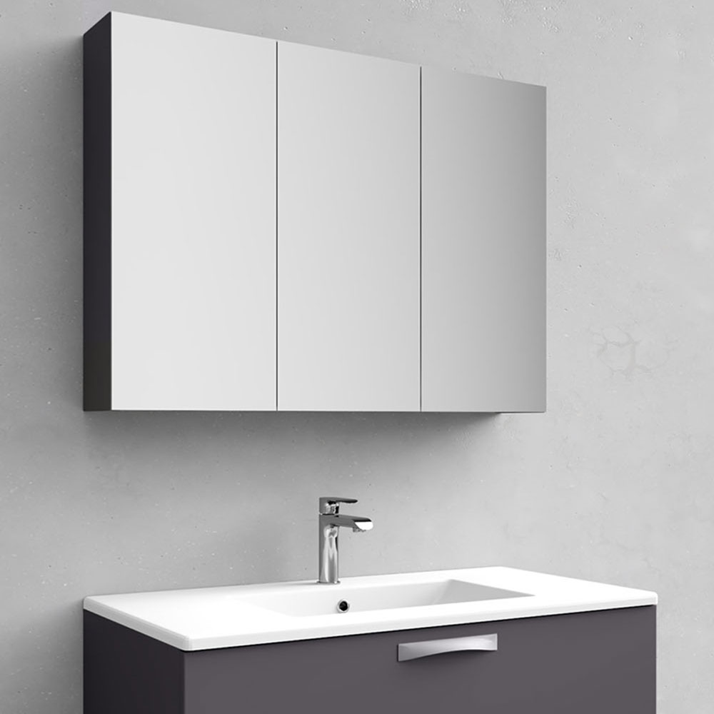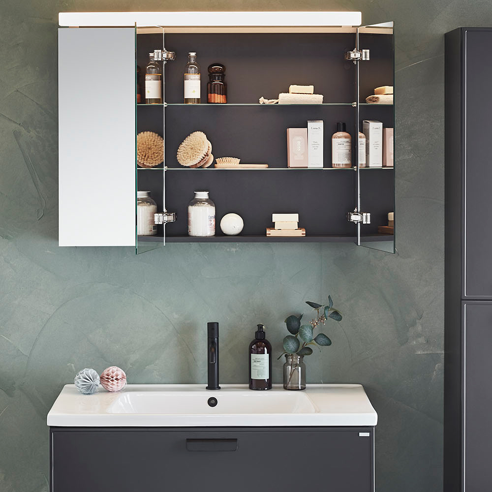 Spegelskåp med dolda, mjukstängande gångjärn. Flyttbara hyllor i klarglas. Speglar på in- och utsida dörrar. Skåpet är förberett för elinstallation med utrymme bakom för t ex. Flex LED-lampa eller Flex LED-belysningsprofil som köps till.