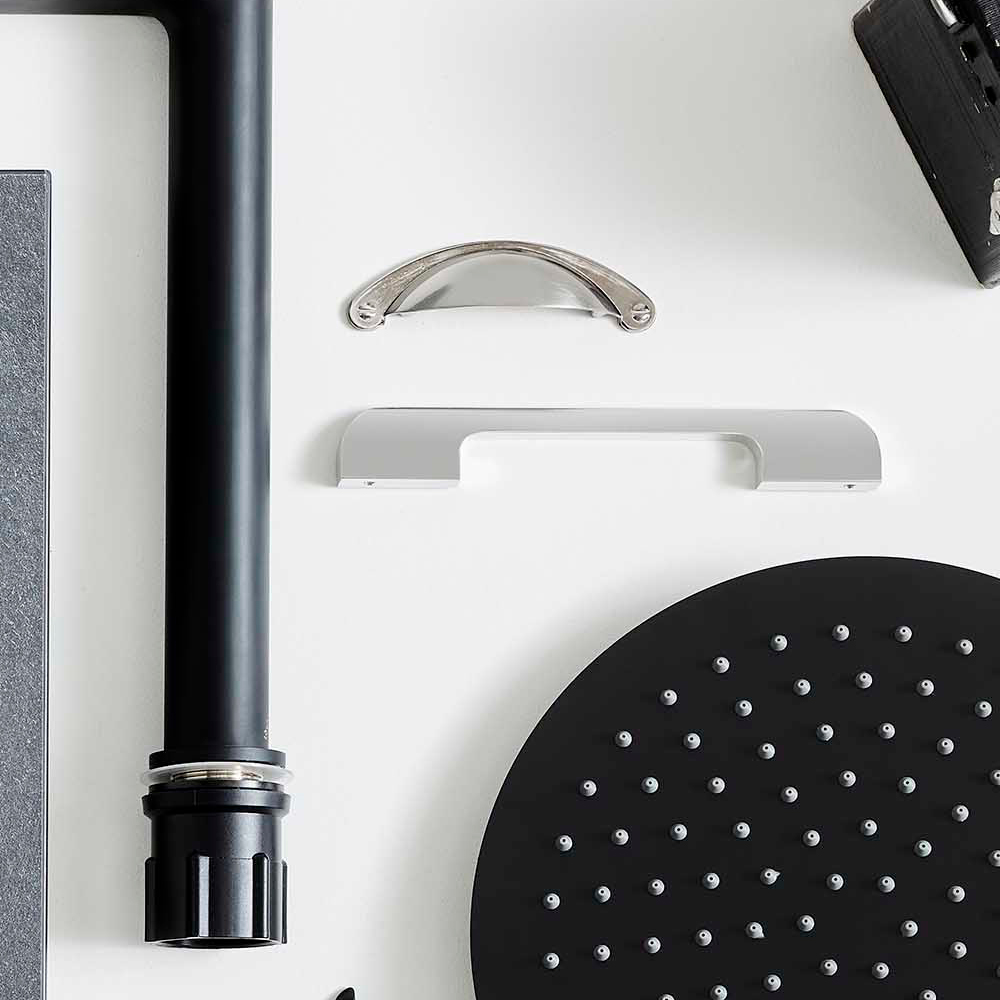 Blankpolerade handtag i aluminium. Finns flera olika storlekar.