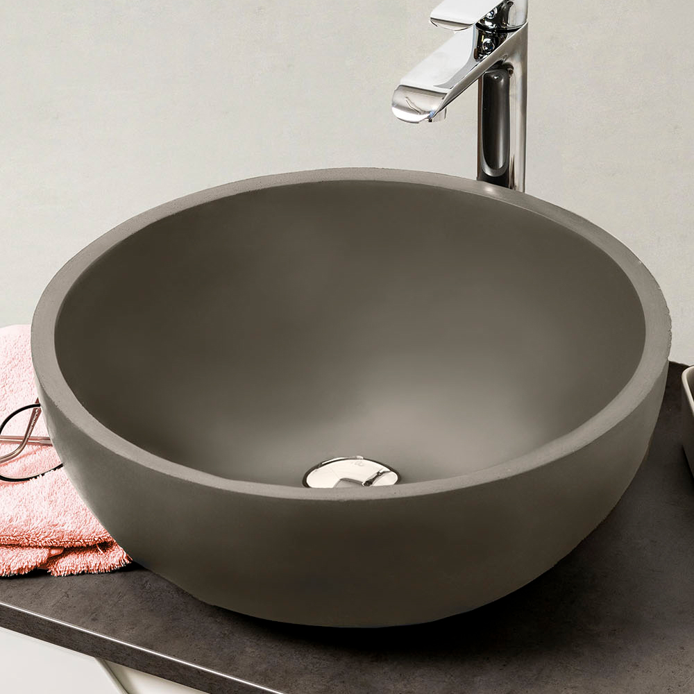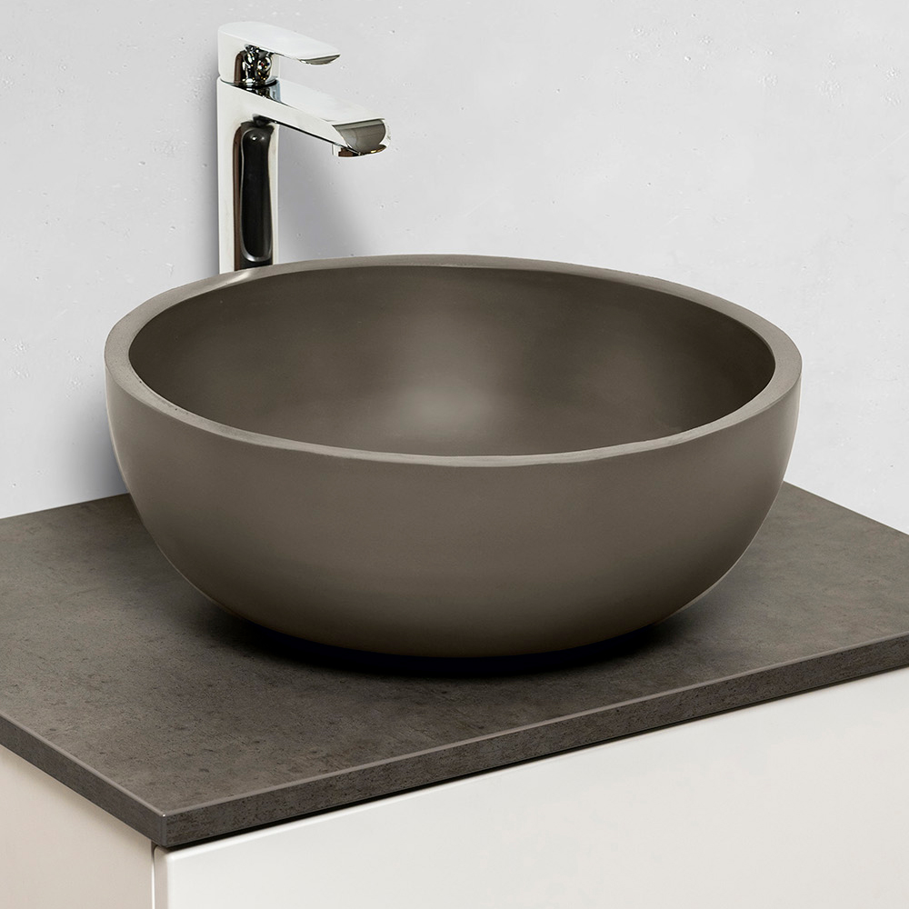 Insidan är förseglad för att stänga betongens porer och göra handfatet mer motståndskraftigt mot fläckar. Utsidan har däremot naturliga porer och en matt, rustik yta som bidrar till den levande känslan. Varje handfat har en släpplinje från formen som placeras mot vägg. Handfatet saknar överfyllnadsskydd, komplettera därför med bottenventil och vattenlås.