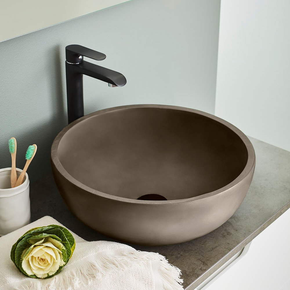 Handfat Cement är ett fristående handfat tillverkat i gjuten betong. Varje exemplar är handgjort och har sitt eget uttryck, vilket ger badrummet en naturlig och genuin karaktär. Betongens yta varierar i kulör och struktur, vilket är en del av materialets charm.