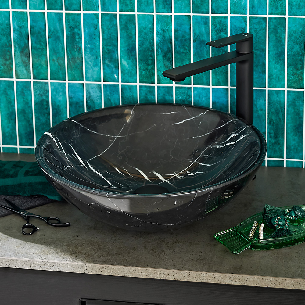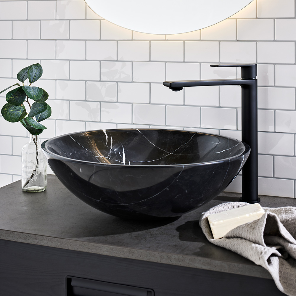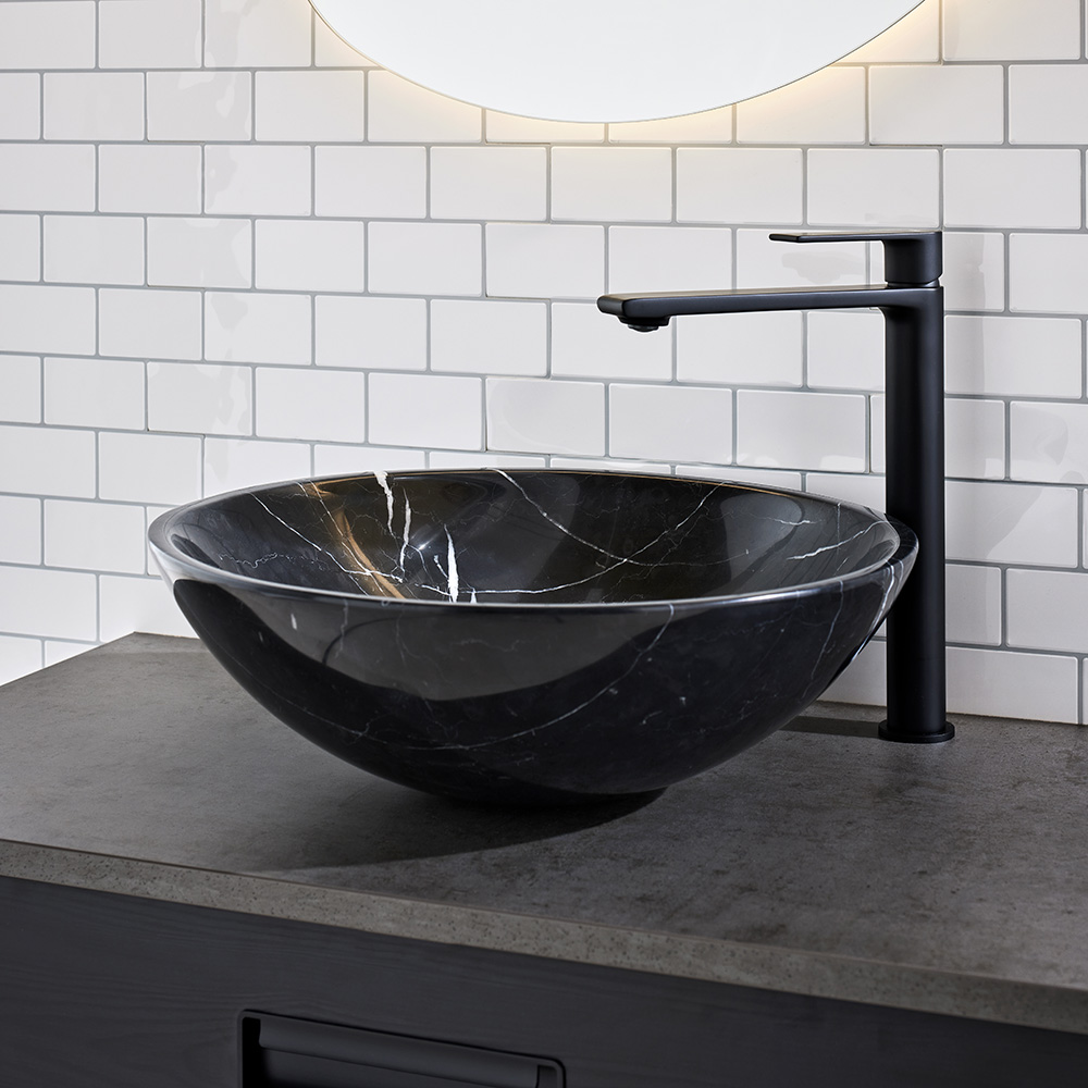 Marbel är ett fristående tvättställ i klassisk skålform, tillverkat av solid svart marmor. Varje handfat är unikt med sin egen naturliga marmorering, vilket gör att just ditt tvättställ får en personlig karaktär. Tvättstället levereras utan överfyllnadsskydd och kompletteras med bottenventil och vattenlås.