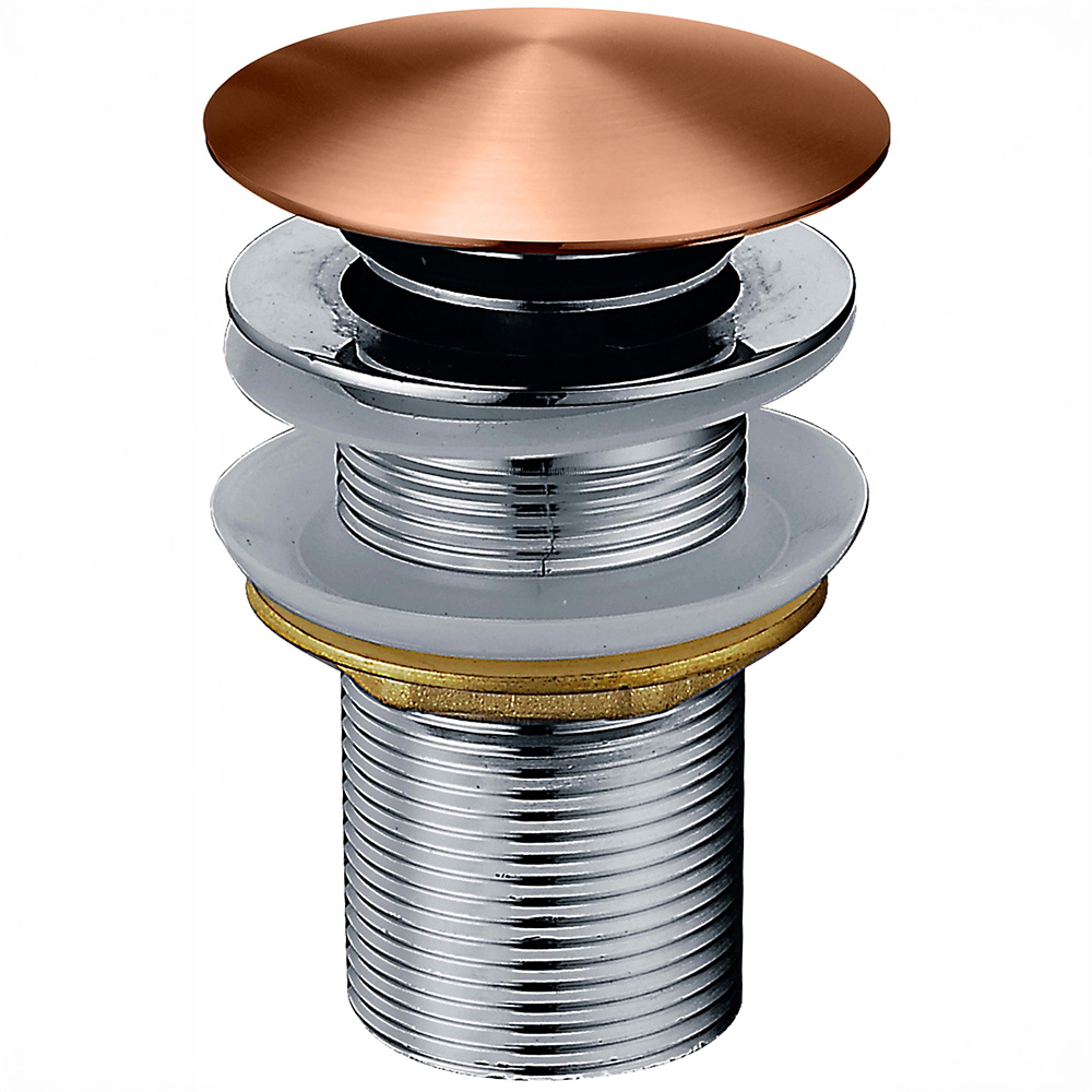 Dekorativ bottenventil i borstad koppar med push-funktion. Passar handfat utan bräddavlopp och ger en elegant detalj i badrummet.
