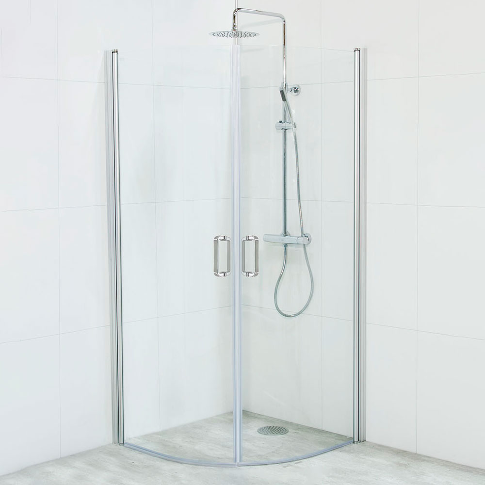 Duschhörn med runda glas och matta aluminiumprofiler. Passar alla typer av badrum.