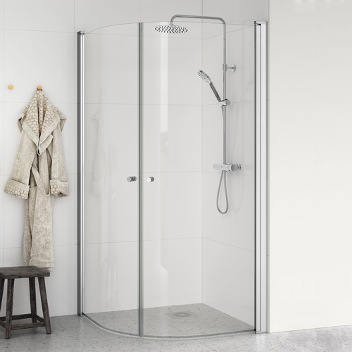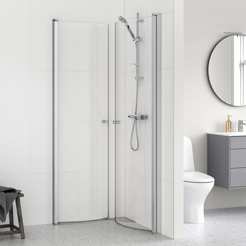 Duschhörna från Gustavsberg i klarglas med blankpolerade aluminiumprofiler. Runda glasdörrar med funktionell design som passar perfekt för alla sorters badrum.