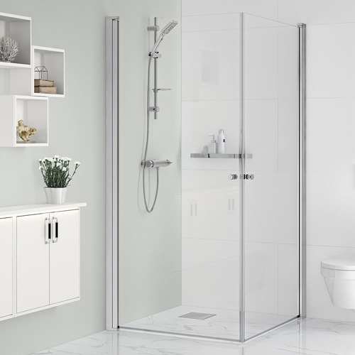 Generöst med duschutrymme på 90 x 90 cm, dörrarna kan även vikas in en bra bit vid städning eller för att spara utrymme. De blankpolerade detaljerna ger ett snyggt intryck som matchar exempelvis blandare eller handdukstork. Dörrarna är utrustade med stigargångjärn vilket betyder att dörren lyfts fem mm och följer golvets fall vid öppning och stängning. Det minskar också golvets slitage.