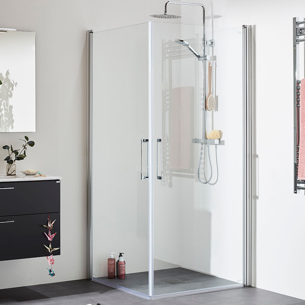 Avskalad och enkel duschhörna med snygga detaljer. Väggarna är tillverkade i härdat säkerhetsglas och är stryktåliga för dagligt bruk. Dörrarna har en svängradie på upp till 180 grader så att du enkelt kan kliva in och ut ur duschen. Det gör det också enklare att komma åt ytor vid städning, dörrarna kan också vikas in för att spara plats. De inbyggda lyftgångjärnen lyfter dörrarna med fem millimeter och följer golvets fall vid öppning och stängning. Det minskar också golvets slitage.