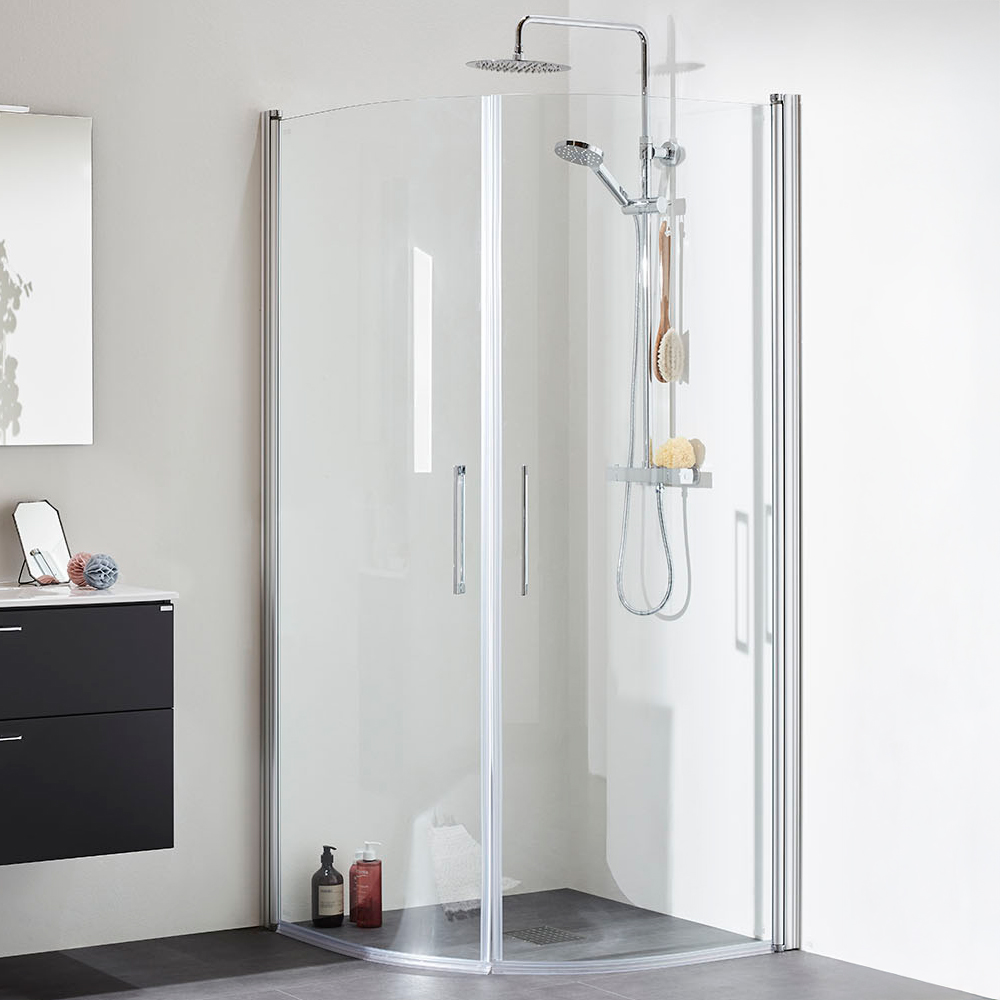 Duschhörna med runda glas och blankpolerade aluminiumprofiler från Noro. Passar alla typer av badrum.