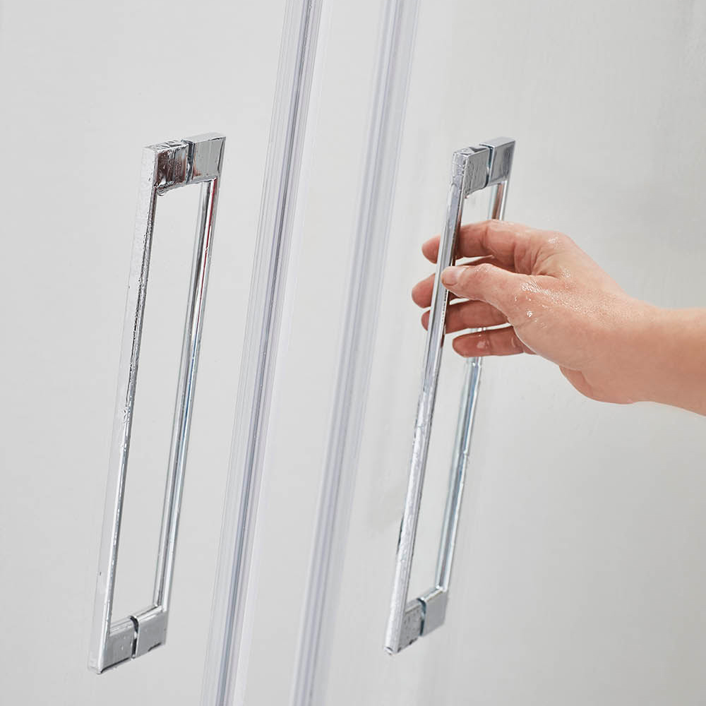Avskalad och enkel duschhörna med snygga detaljer. Väggarna är tillverkade i härdat säkerhetsglas och är stryktåliga för dagligt bruk. Dörrarna har en svängradie på upp till 180 grader så att du enkelt kan kliva in och ut ur duschen. Det gör det också enklare att komma åt ytor vid städning, dörrarna kan också vikas in för att spara plats. De inbyggda lyftgångjärnen lyfter dörrarna med fem millimeter och följer golvets fall vid öppning och stängning. Det minskar också golvets slitage.