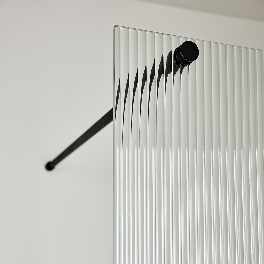 Noro Frost är en stilren duschvägg i 8 mm mönstrat säkerhetsglas med svarta profiler. Räfflorna i glaset skapar ett diskret insynsskydd samtidigt som ljuset sprids i rummet. Modellen levereras med handduksknopp och en kapbar draperistång på 120 cm. Väggens flexibla konstruktion gör att den kan monteras både i vägg och tak, och den klarar golvfall upp till 10 mm.