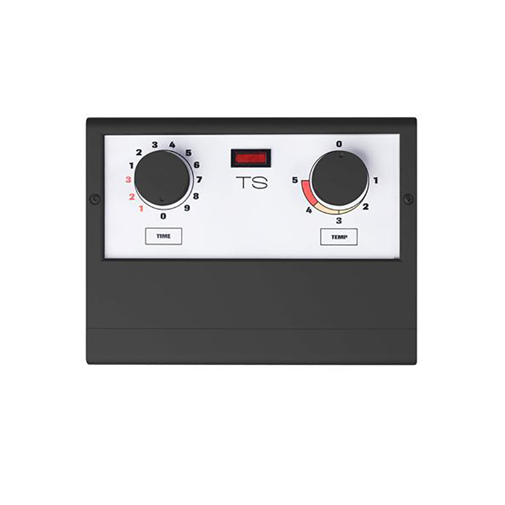 TS 30-012 har vred för en enkel inställning av önskad temperatur och badtid. Den placeras på väggen utanför bastun med ett maxavstånd på 1,8 m från termostatens placering i bastun.