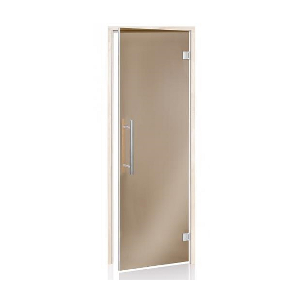 Bastudörren har eleganta gångjärn och fint handtag i trä och rostfritt stål. En magnetlist gör att dörren stängs enkelt och effektivt. Karmen är i asp som är 42x92 mm, glasets mått är sedan 620x1835 mm.