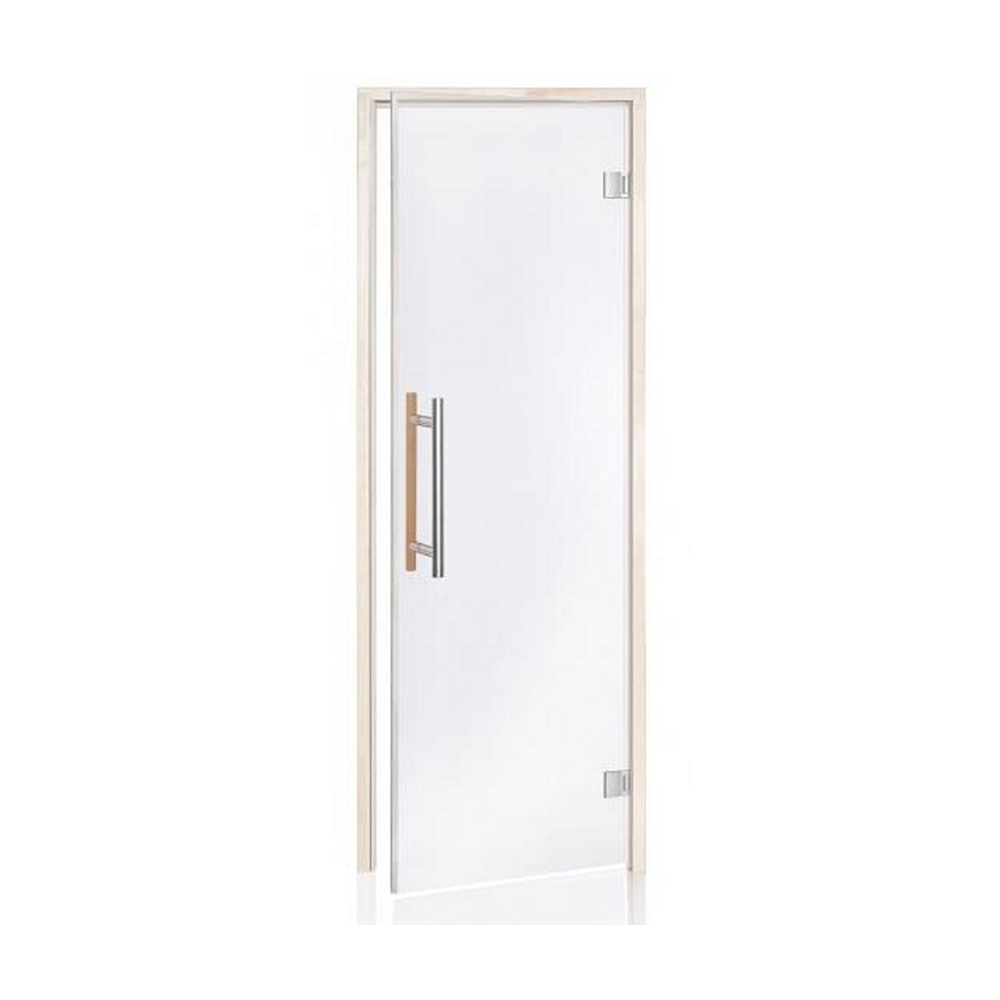 Bastudörren har eleganta gångjärn och fint handtag i trä och rostfritt stål. En magnetlist gör att dörren stängs enkelt och effektivt. Karmen är i asp som är 42x92 mm, glasets mått är sedan 620x1835 mm.