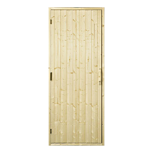 Dörren är isolerad med 40 mm mineralull. In- och utsidan av dörren är av obehandlad granpanel.