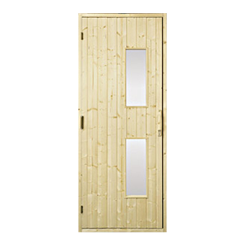 Dörren är isolerad med 40 mm mineralull. In- och utsidan av dörren är av obehandlad granpanel med två glasöppningar.