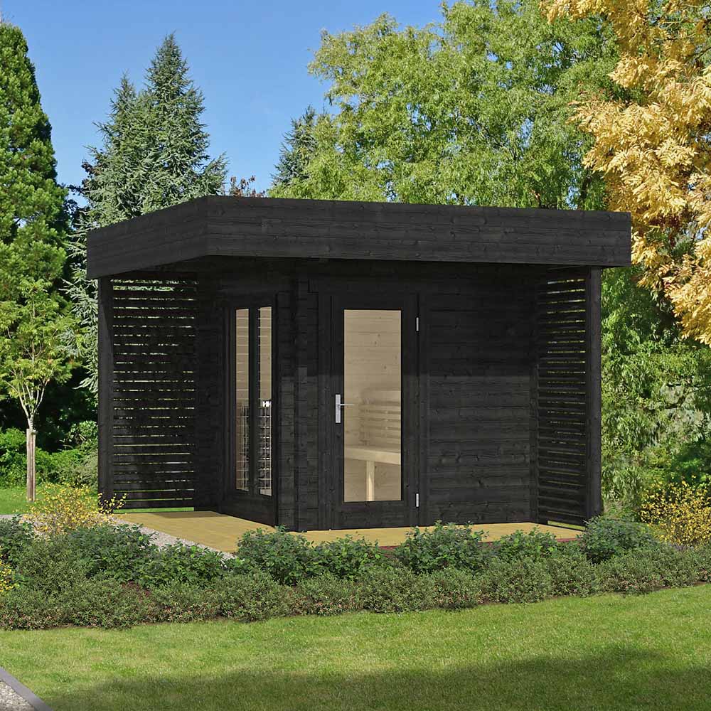 Observera att kulören på bilden är ett exempel på hur bastustugan kan se ut efter målning. Den levereras obehandlad. Bastuaggregat och inredning ingår ej.