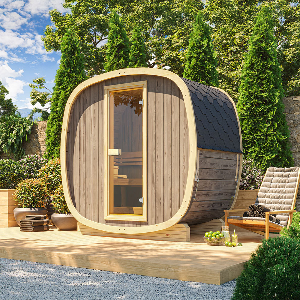 Välj mellan en bastu i obehandlad gran, som behöver oljas för skydd mot fukt och slitage, eller en i värmebehandlat termoträ. Termoträ är formstabilt, vattenavvisande och har hög rötbeständighet tack vare en intensiv torkprocess.