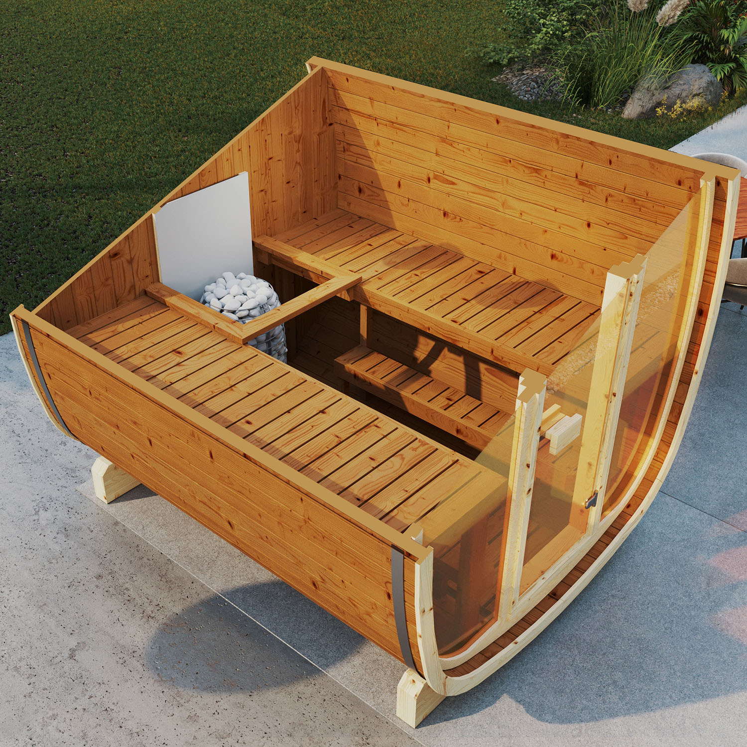 Den nätta designen gör att tunnan smälter in både i moderna och klassiska trädgårdar, och den glasade framsidan ger ett elegant intryck och känslan av mer utrymme än en traditionell bastutunna. Taket har shingel och de rostfria tunnbanden runt tunnan bidrar till en extra hållbar struktur. Bastun är tillverkad i termoträ som är ett formstabilt och vattenavvisande material med hög rötbeständighet tack vare en intensiv torkprocess.