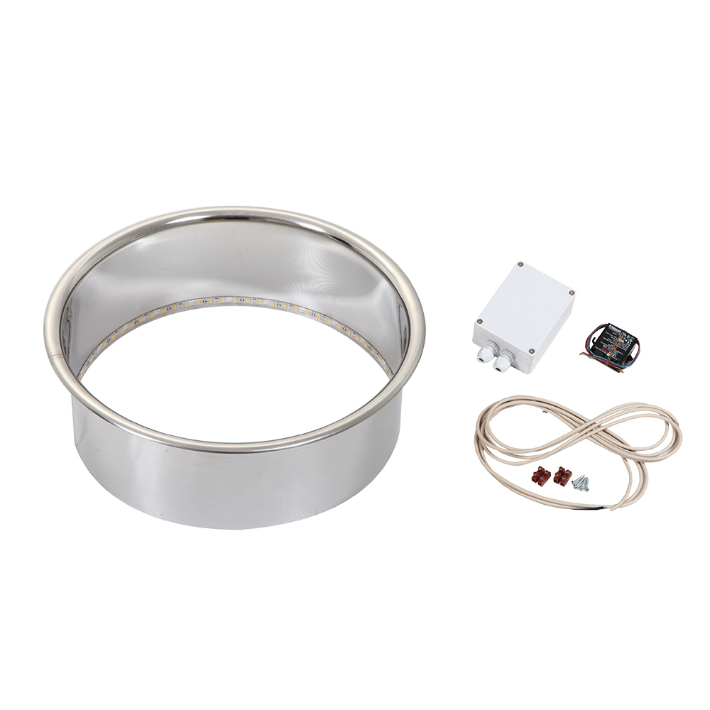 Infällningsramen är tillverkad i rostfritt stål och fungerar även som ett skydd mot värmestrålning och därför blir öppningen för insänkningen i laven bara aningen större än bastuaggregatets yttre diameter.