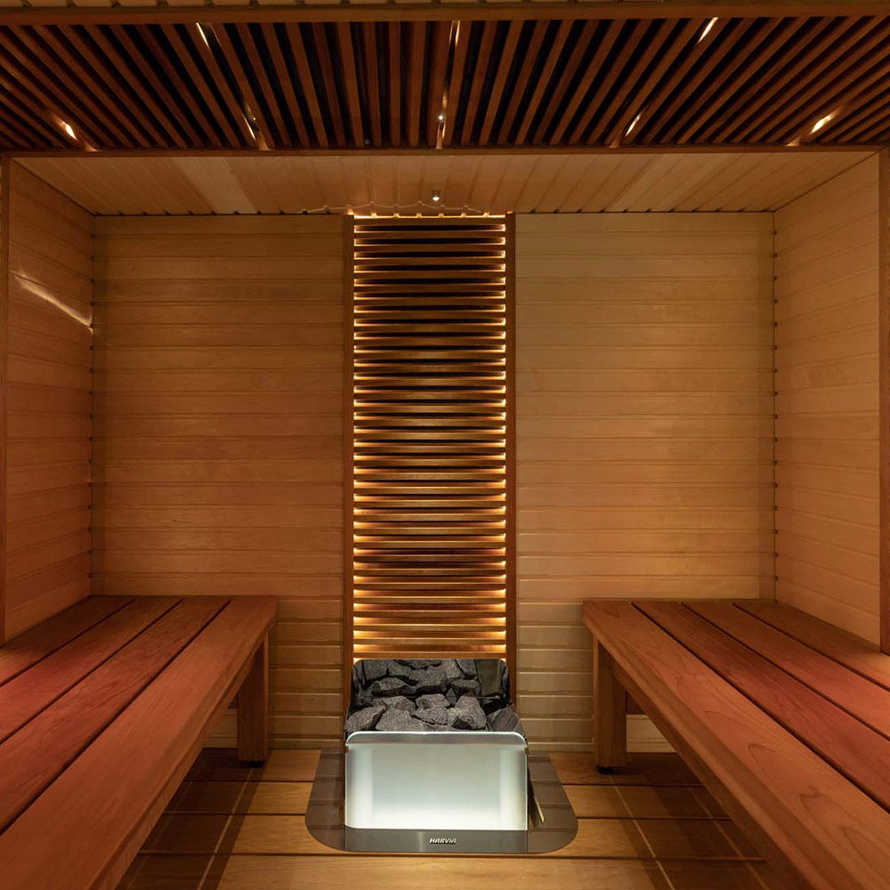 Den transparenta skärmen av Optiwhite-glas reflekterar den mjuka LED-belysningen vackert och fulländar stämningen i bastun. Glaset är härdat, vilket gör det tryggt att använda.