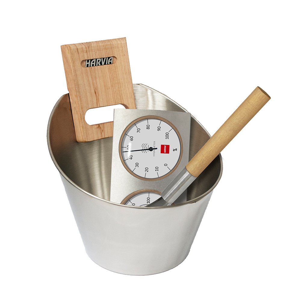 Detta trevliga kit med bastuprodukter innehåller stäva och skopa i rostfritt stål samt en fukt- och temperaturmätare med tydlig display.