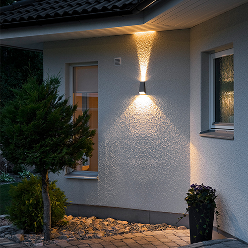 Vägglykta från Konstsmide med en transparent öppning i över- och nederkant av armaturen. Ger ett fint sken åt båda håll och passar perfekt vid entrén eller där det behövs extra ljus.