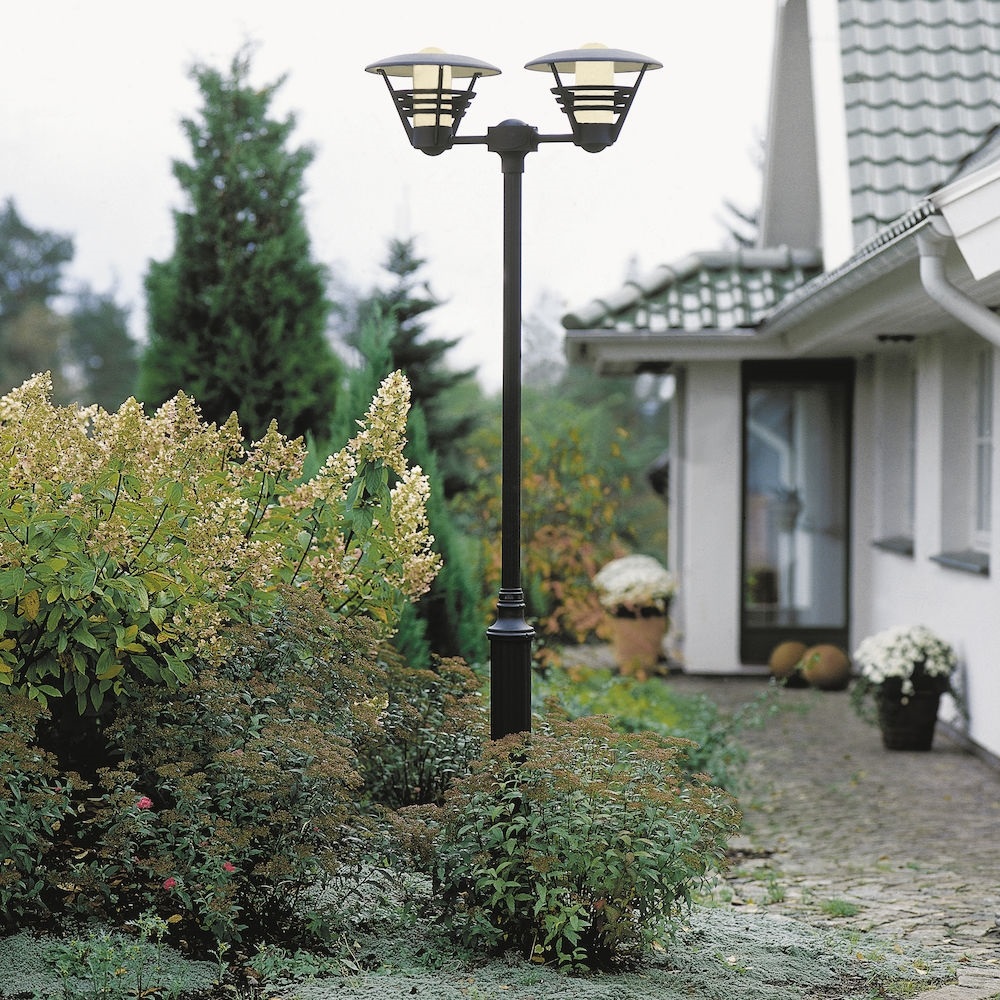 Stolplykta Konstsmide Gemini 2-arm E27 utan Stolpe är en modern stolplykta med dubbla lyktor som levereras utan stolpe. Lyktorna har opalfärgat glas och den är IP 23-klassad. Denna stolplykta är anpassad för utomhusbruk och levereras utan ljuskälla.