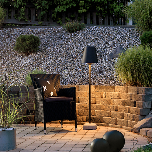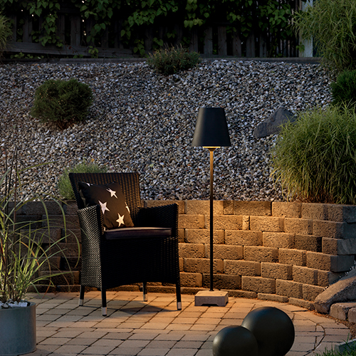 Skärmen är gjord av metall med nedåtriktat ljus. Golvlampan är gjord för användning utomhus och klarar även kallare temperaturer.