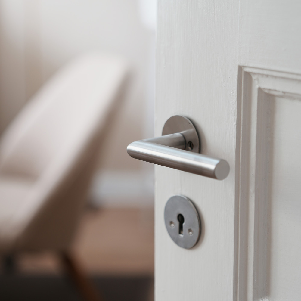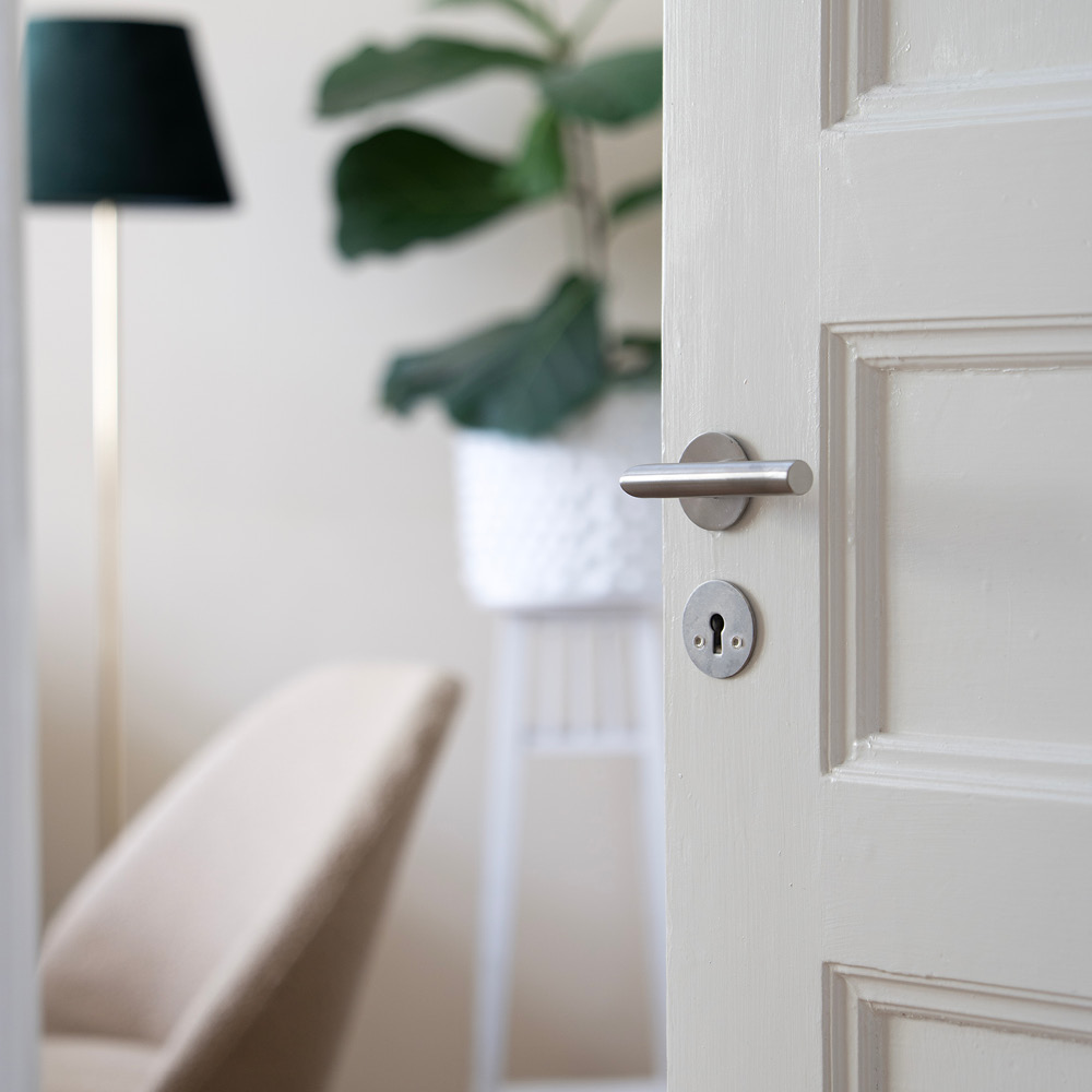 Stilrent dörrhandtag för innerdörr med dold fastsättning. Avsedd för låskistor enl. skandinavisk standard.
