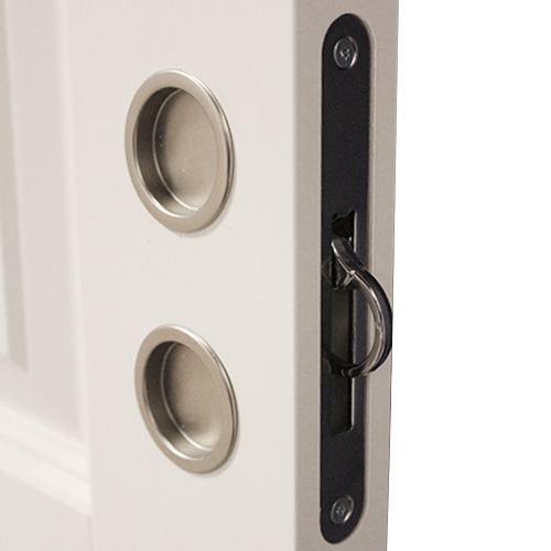 Dragbeslag i matt förnicklat stål, monterat i dörrbladets framkant.