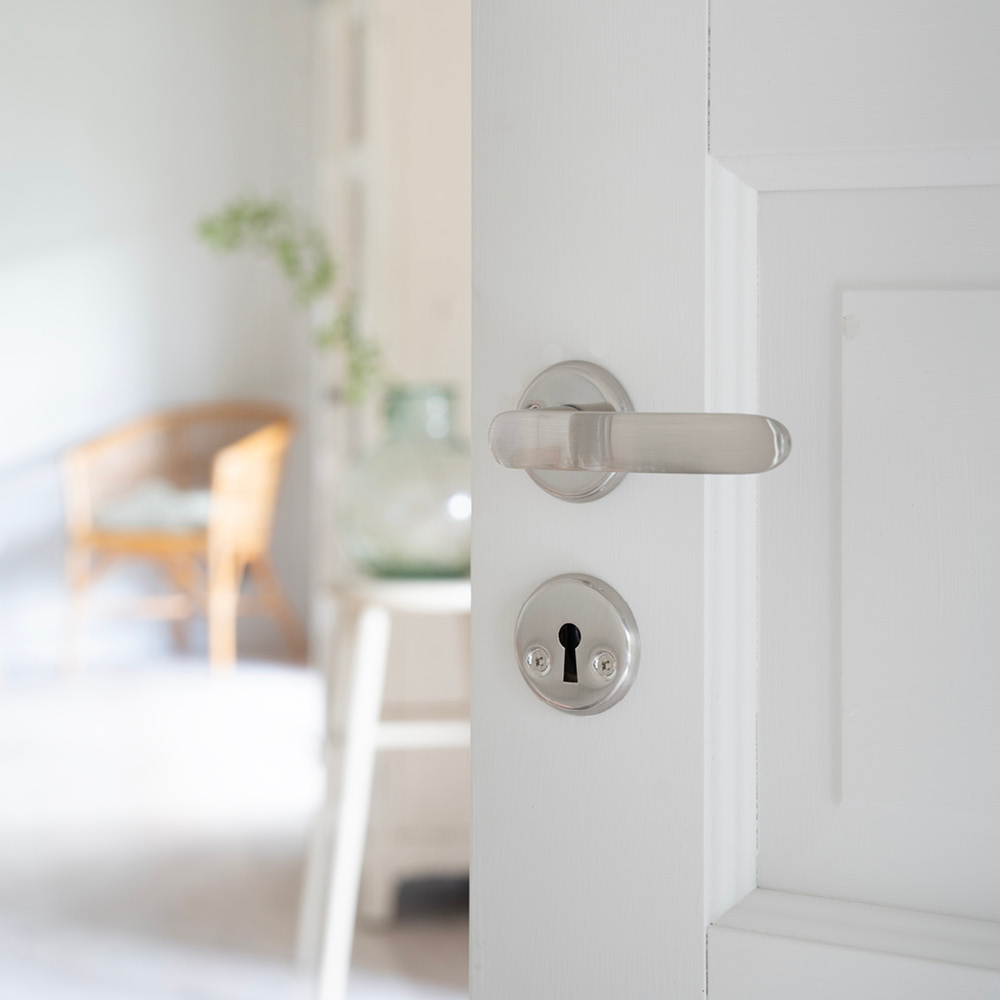 Paketet innehåller Handtag och nyckelbrickor för båda sidor av dörren. Handtaget passar till Innerdörrar med tjocklek 38-45 mm.