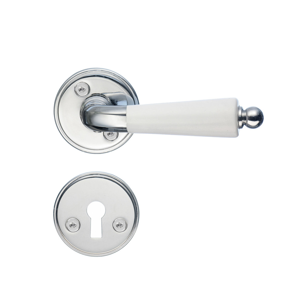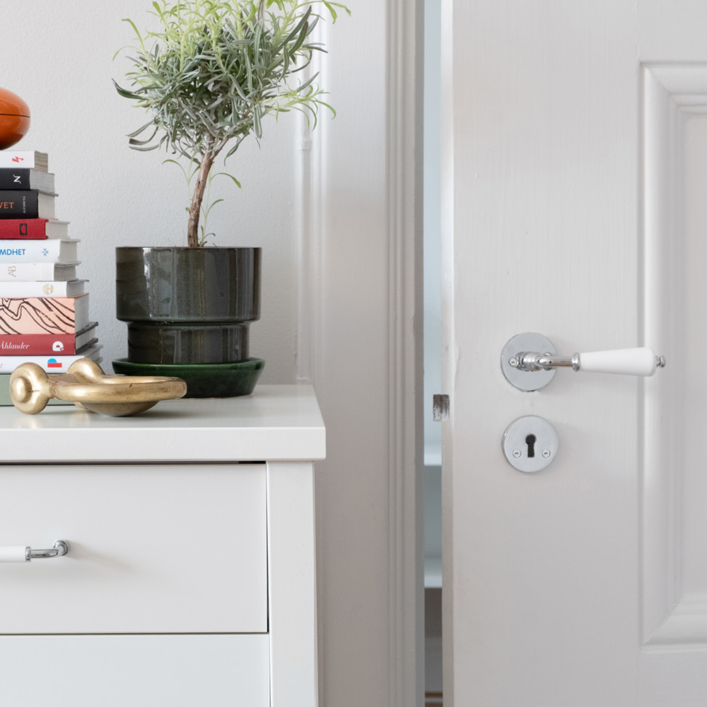 Prisvärt handtag med ett vitt grepp och yta i polerad krom. Bytet av dörrhandtag är ett snabbt och lätt sätt att skapa en ny känsla i ditt hem. Handtagets vita grepp är av slittålig ABS plast.