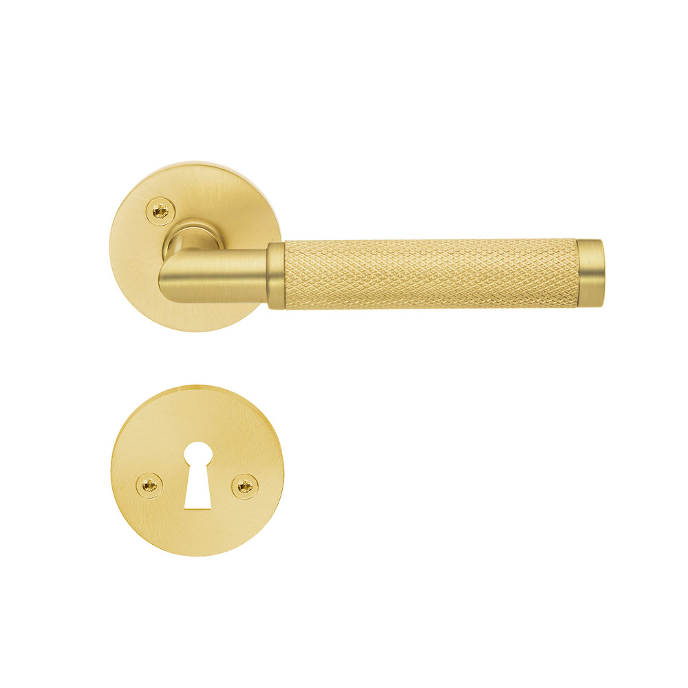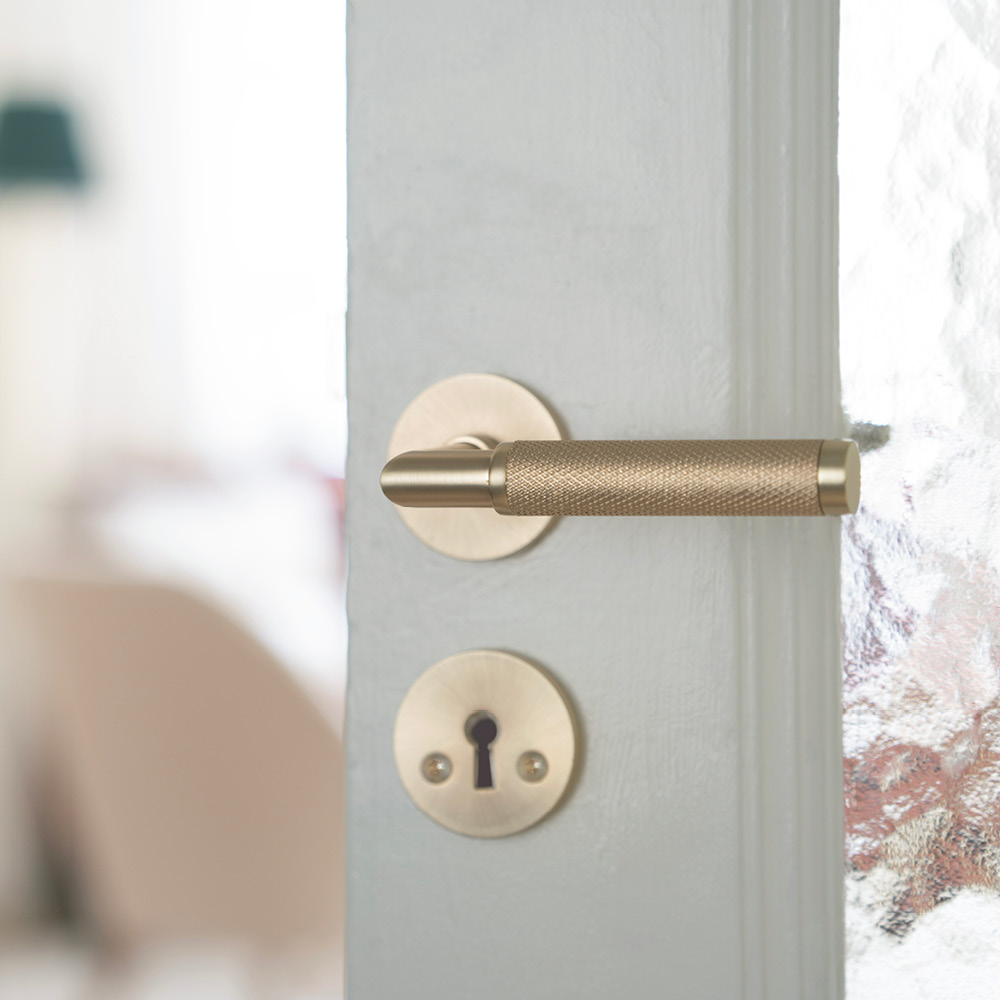 Detta moderna innerdörrshandtag och nyckelskyltar har en borstad mässingfinish och ett lettrat grepp som blir en fin detalj på handtaget. Att byta dörrhandtag är ett snabbt och billigt sätt att ge ditt hem en helt ny känsla. Handtaget och nyckelskyltarna är i zink med en borstad mässingyta.